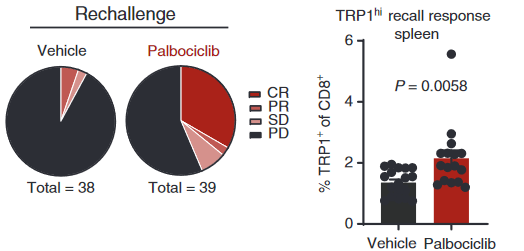 30天后,研究人员又在小鼠另一侧构建黑色素肿瘤模型,尝试用B16肿瘤再次激发抗肿瘤免疫。他们发现, 接受palbociclib处理过的CD8T细胞组小鼠比空白对照组小鼠表现更好,完全排斥肿瘤的小鼠比例更高,而且其脾脏中TRP1 high CD8T细胞的数量更多