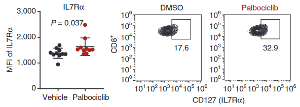 为了进一步确定接受palbociclib全身治疗的小鼠是否可以观察到免疫记忆增强,Dougan教授团队在给小鼠口服palbociclib 7天后,在脾脏中检测抗原特异性CD8T细胞上IL-7Rα的表达情况。他们发现,与对照组相比,palbociclib治疗组小鼠抗原特异性CD8 T细胞上IL-7Rα表达水平更高。这表明记忆前体细胞水平增加。由此可以得出结论: CDK4/6抑制剂可促进记忆性T细胞的形成。