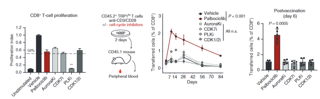 为了排除palbociclib诱导CD8T细胞的长期持续存在与细胞周期无关,作者选取了多种细胞周期抑制剂进行对比。