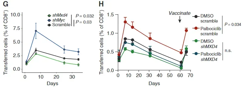 经过深入研究后,Dougan教授团队最终发现:在小鼠实验中,CDK4/6抑制剂是通过增加小鼠的CD8T细胞的Mxd4,继而沉默Myc,从而导致其转向记忆潜能细胞。