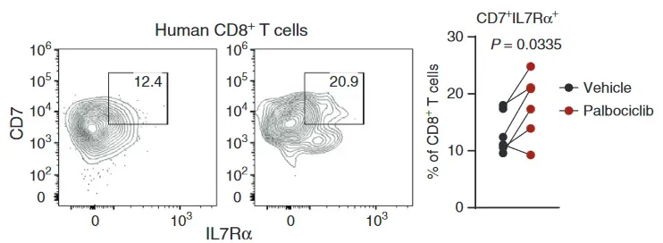 为了验证人类身体中也会发生这种机制,Dougan教授团队先从健康献血者外周血中分离出CD8T细胞,并在空白对照或palbociclib存在下,用抗CD3/28磁珠体外活化CD8T细胞,48小时后检测细胞的IL7Rα和CD7的表达水平。