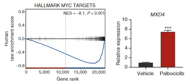 同样在人体中,48小时后对细胞进行进行RNA测序,相较于不加palbociclib组,加入palbociclib时激活的CD8T细胞在基因表达水平上Mxd4是最大的差异基因。